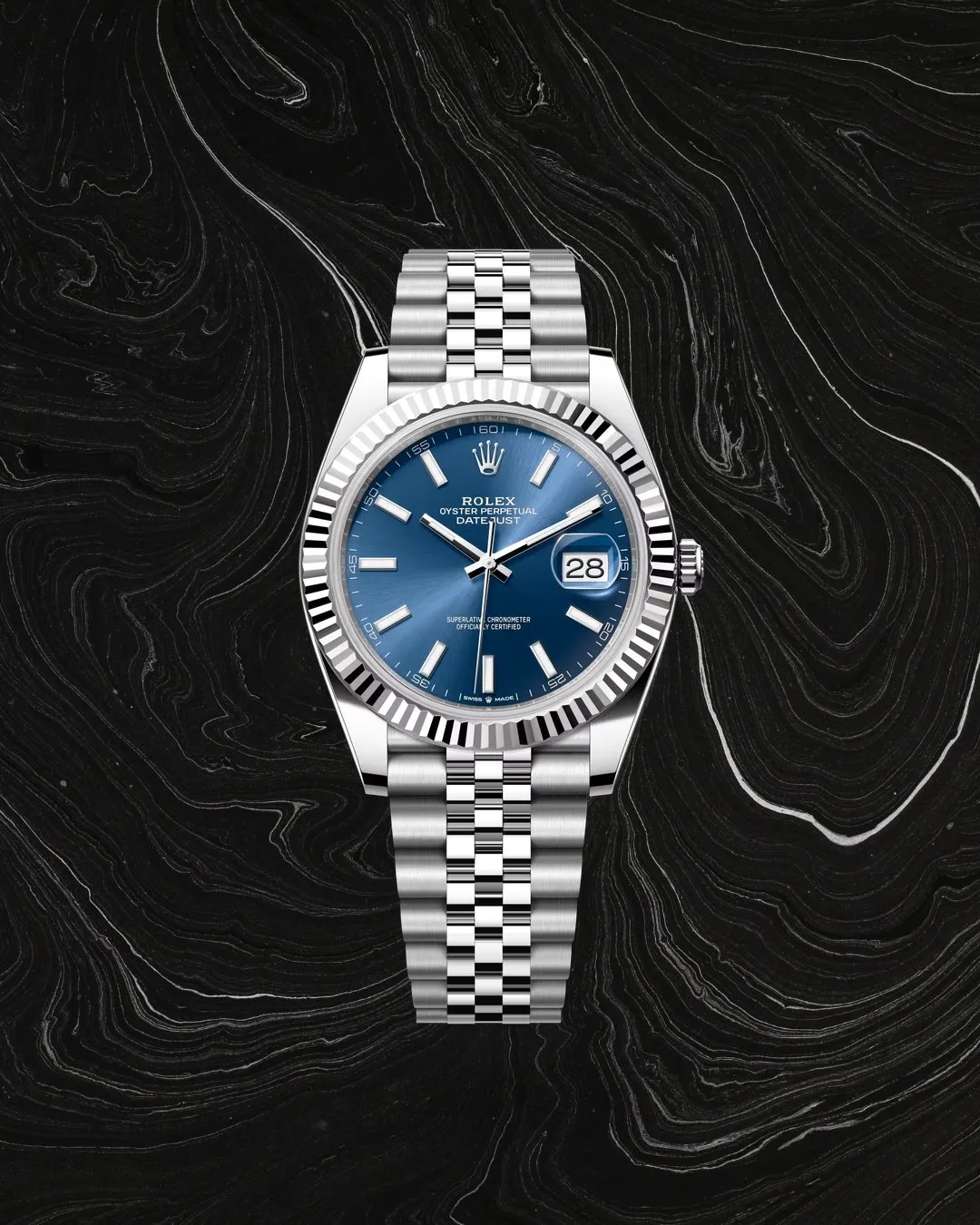 Rolex Datejust 41mm, Oystersteel & White Gold, Fluted bezel, Bright Blue dial, Jubilee bracelet.