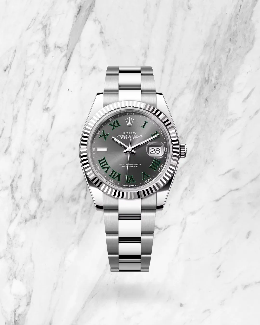 Rolex Datejust 41mm, Oystersteel & White Gold, Fluted bezel, Slate with Green Roman Numerals (Wimbledon) dial, Oyster bracelet.
