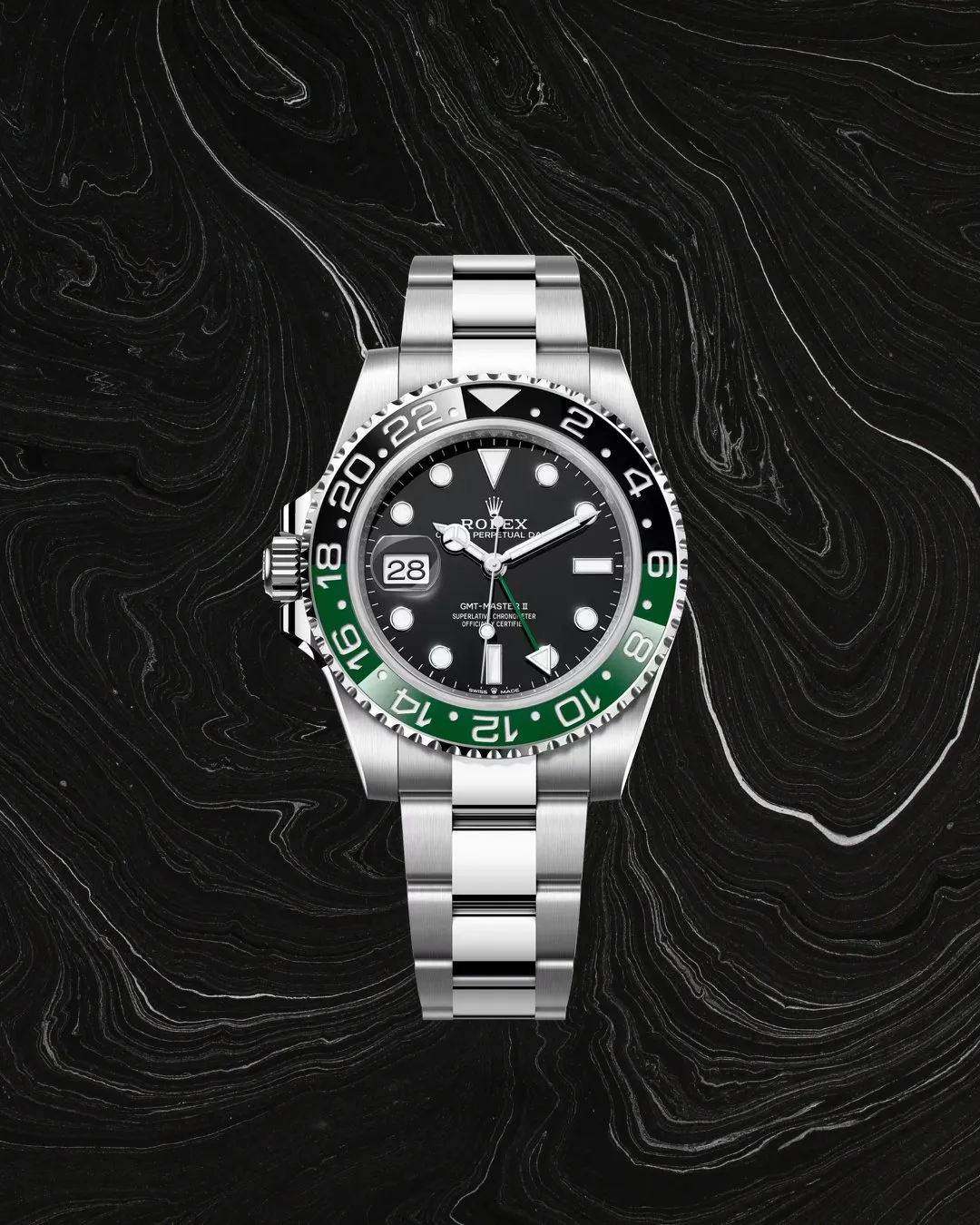 Rolex GMT-Master II 40mm, Oystersteel, Cerachrom Black & Green (Sprite) bezel, Black dial, Jubilee bracelet. Left-handed crown (Destro).