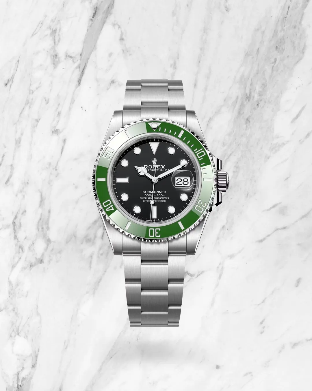 Rolex Submariner 41mm, Oystersteel, Cerachrom Green bezel, Black dial, Oyster bracelet.